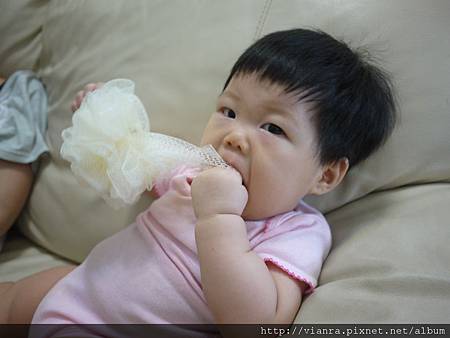 丟顆泡泡球跟安安玩, 好像在逗貓一樣!