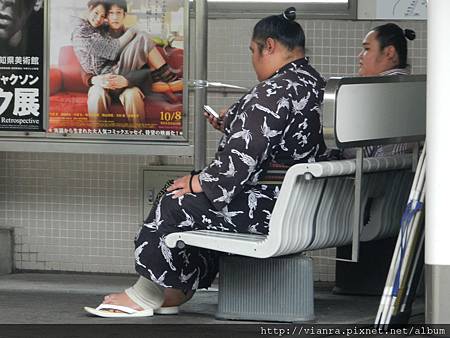 在月台上看到兩位相撲力士耶~ 偷拍一下就要出站換搭乘Linimo